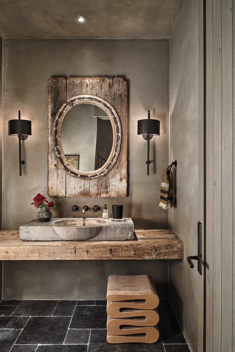“Reclaimed wood vanities with unique details highlight the trend of incorporating authentic materials into bathroom spaces. The featured powder room features a French-style chest converted into a vanity, offering warmth and history through the organic wood grain and delicate hardware. The combination of natural wood with polished fixtures such as a hammered metal sink creates a perfect balance between rustic charm and modern luxury. To achieve this look, homeowners can look for vintage or antique furniture pieces and retrofit them for bathroom use.